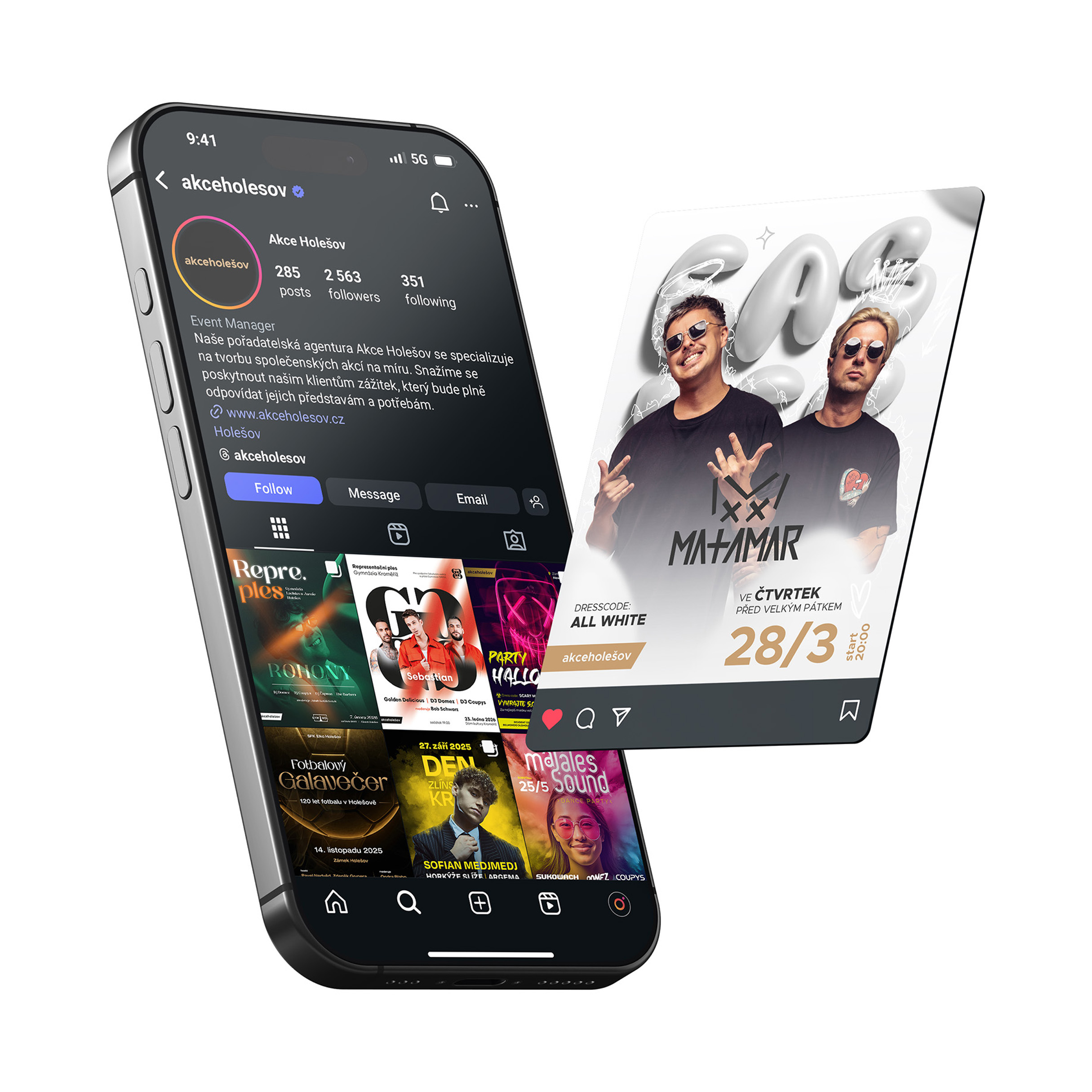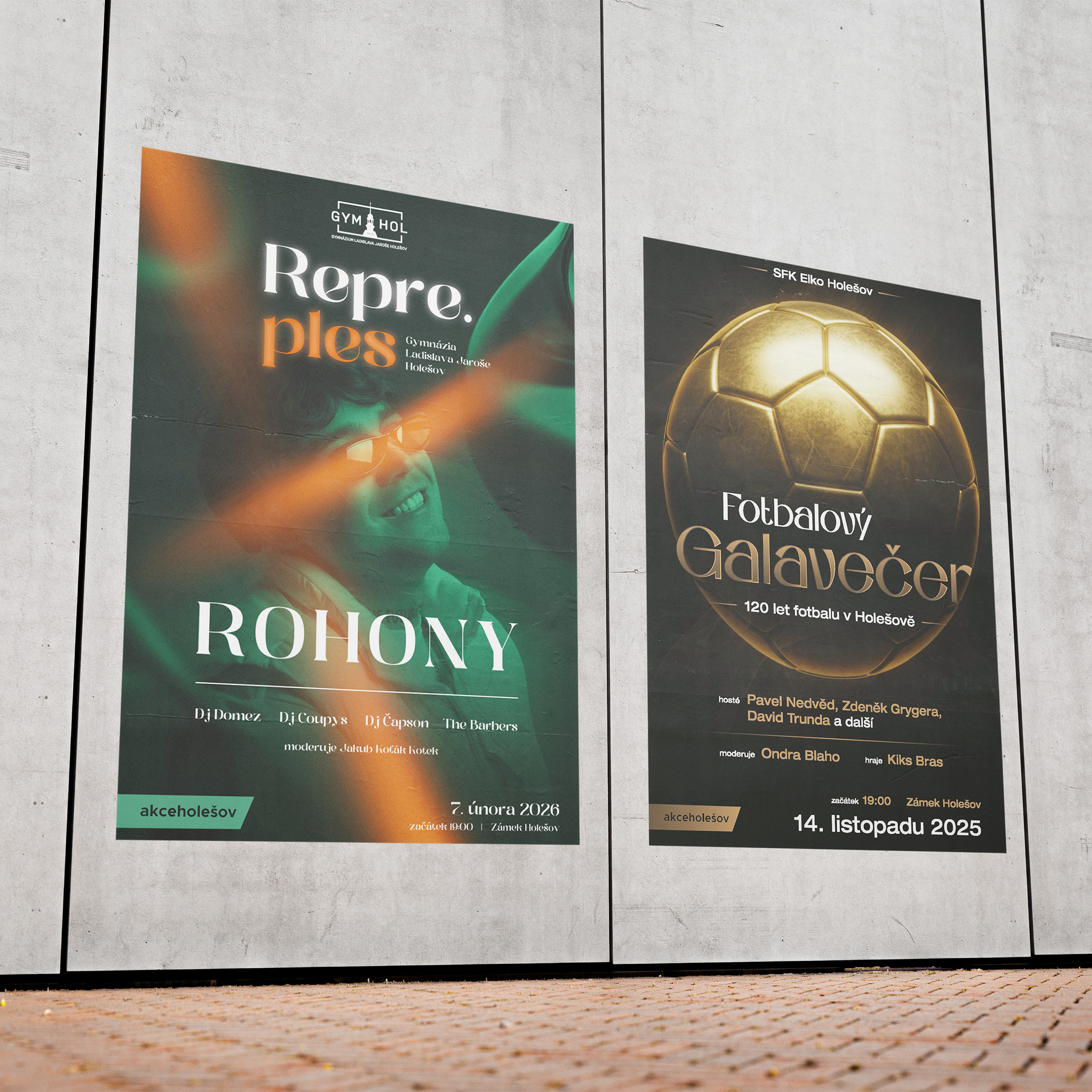 Ukázky vizuálních výstupů vytvořených pro agenturu Akce Holešov, která se zaměřuje na pořádání společenských a hudebních akcí v rámci Zlínského kraje, jako jsou plesy, party a festivaly. V rámci dlouhodobé spolupráce vznikaly grafické materiály pro více než 30 různých akcí – od menších lokálních událostí až po rozsáhlé projekty, včetně hudebního festivalu MusicTON.