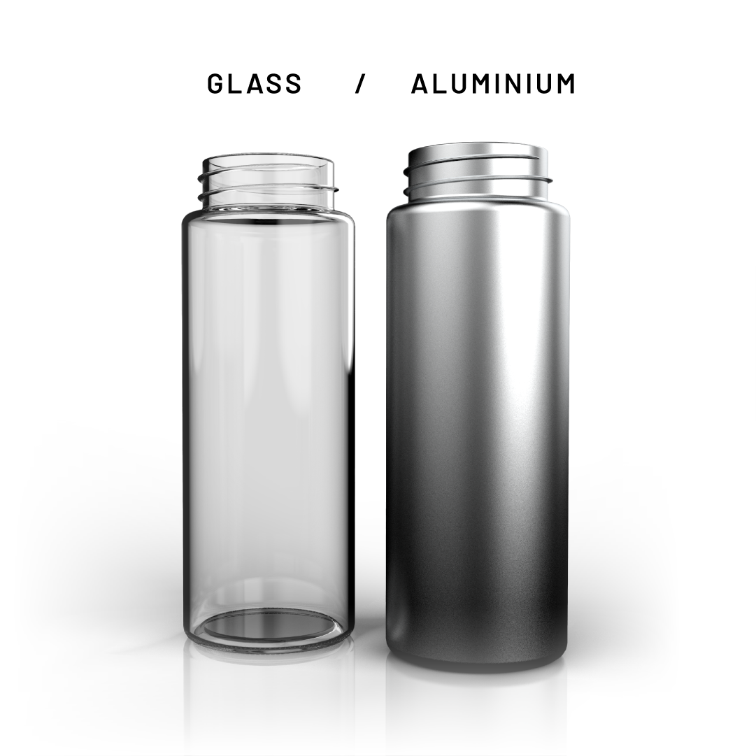 Hlavní tělo lahve je navrženo ve variantách ze skla nebo hliníku z důvodu zdravotní nezávadnosti. Pouzdro je řešeno z recyklovaných materiálů, které chrání lahev při každodenním používání.